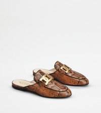 Mules in reptile print leather with branded metal chain accessory. Finished with smooth leather piping, this easy-chic style comes with a flat leather outsole. - Made in Italy - Women's leather mules - Leather upper - Reptile print - Branded metal chain accessory - Leather insole - Leather heel with rubber detailing - Rubber outsole - Maintenance and care cards included - Branded dustbag