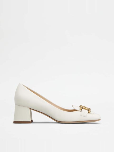 Pumps in calfskin leather, with squared toe and iconic branded metal chain accessory. Featuring a covered medium heel and leather outsole, they are a refined style that combines comfort and elegance. - Made in Italy - Pumps in leather - Calfskin leather upper - Branded metal chain accessory - Leather insole - Covered heel 2 ins - Leather outsole - Maintenance and care cards included - Branded dustbag
