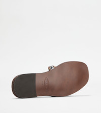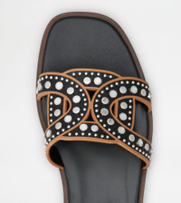 Sandals in calfskin leather with studs, characterized by a band that reproduces the iconic chain accessory. Featuring a leather outsole, they are a versatile and comfortable creation for your everyday summer look. - Made in Italy - Women's flat sandals - Calfskin leather upper - Applied studs - Leather insole - Leather heel with rubber insert - Leather outsole - Maintenance and care cards included - Branded dustbag