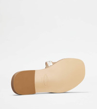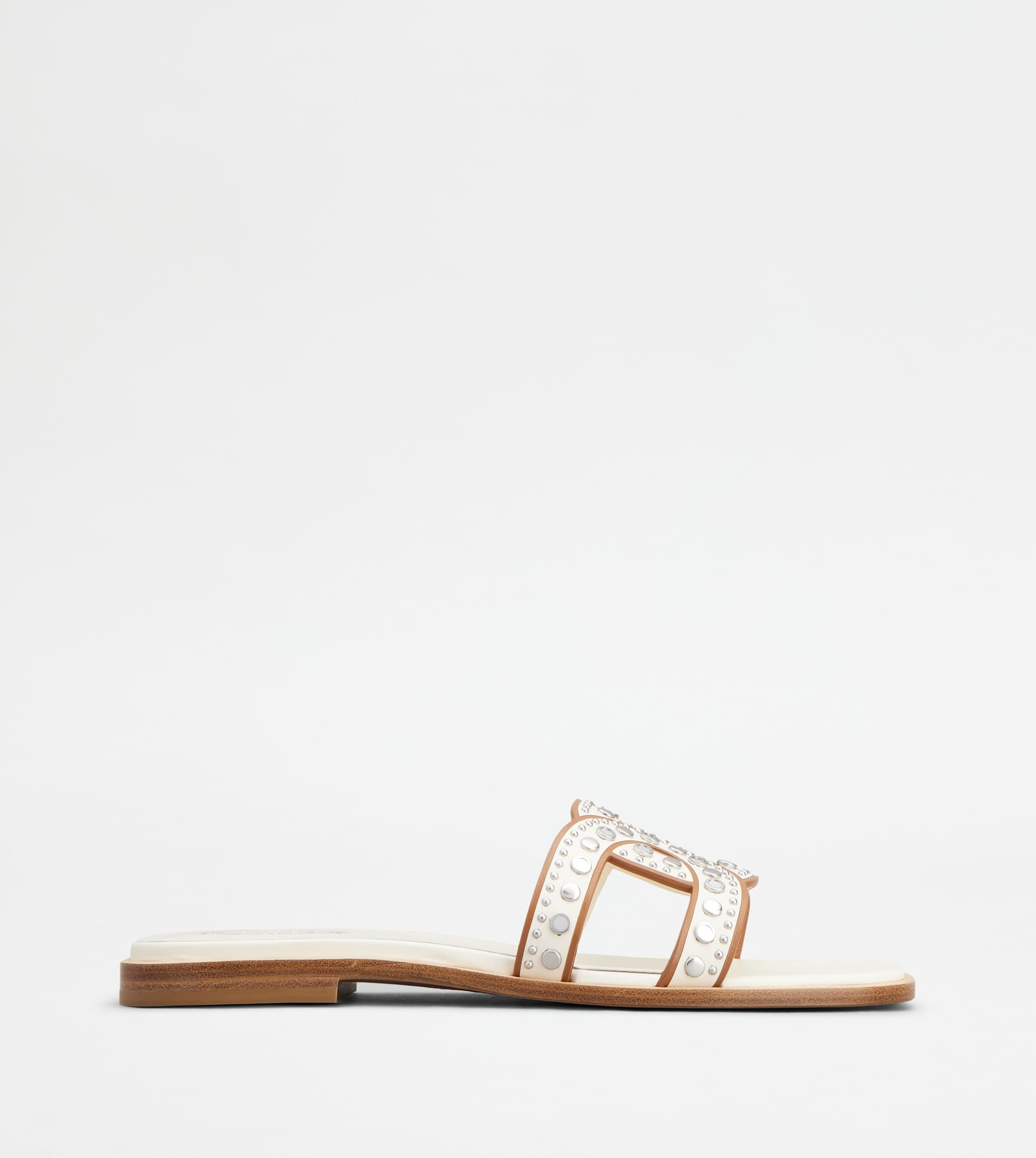 Sandals in calfskin leather with studs, characterized by a band that reproduces the iconic chain accessory. Featuring a leather outsole, they are a versatile and comfortable creation for your everyday summer look. - Made in Italy - Women's flat sandals - Calfskin leather upper - Applied studs - Leather insole - Leather heel with rubber insert - Leather outsole - Maintenance and care cards included - Branded dustbag