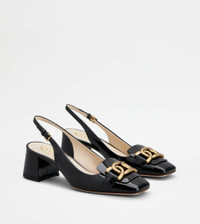 Slingback pumps in patent leather with squared toe and branded metal chain accessory. Featuring covered medium heel and leather outsole, they are a refined style that combines comfort and elegance. - Made in Italy - Slingback in patent leather - Calfskin leather upper - Patent leather finishing - Branded metal chain accessory - Heel strap - Leather insole - Covered heel 2 ins - Leather outsole - Maintenance and care cards included - Branded dustbag