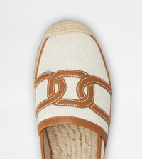 Slip-ons in linen blend canvas with leather inserts and iconic chain pattern. A summer creation with an easy and refined mood at once, characterized by a cord insole and piping. - Espadrilles in fabric - Linen blend cotton upper - Calfskin leather inserts - Jute insole with leather detailing - Rubber outsole with jute piping - Maintenance and care cards included - Branded dustbag