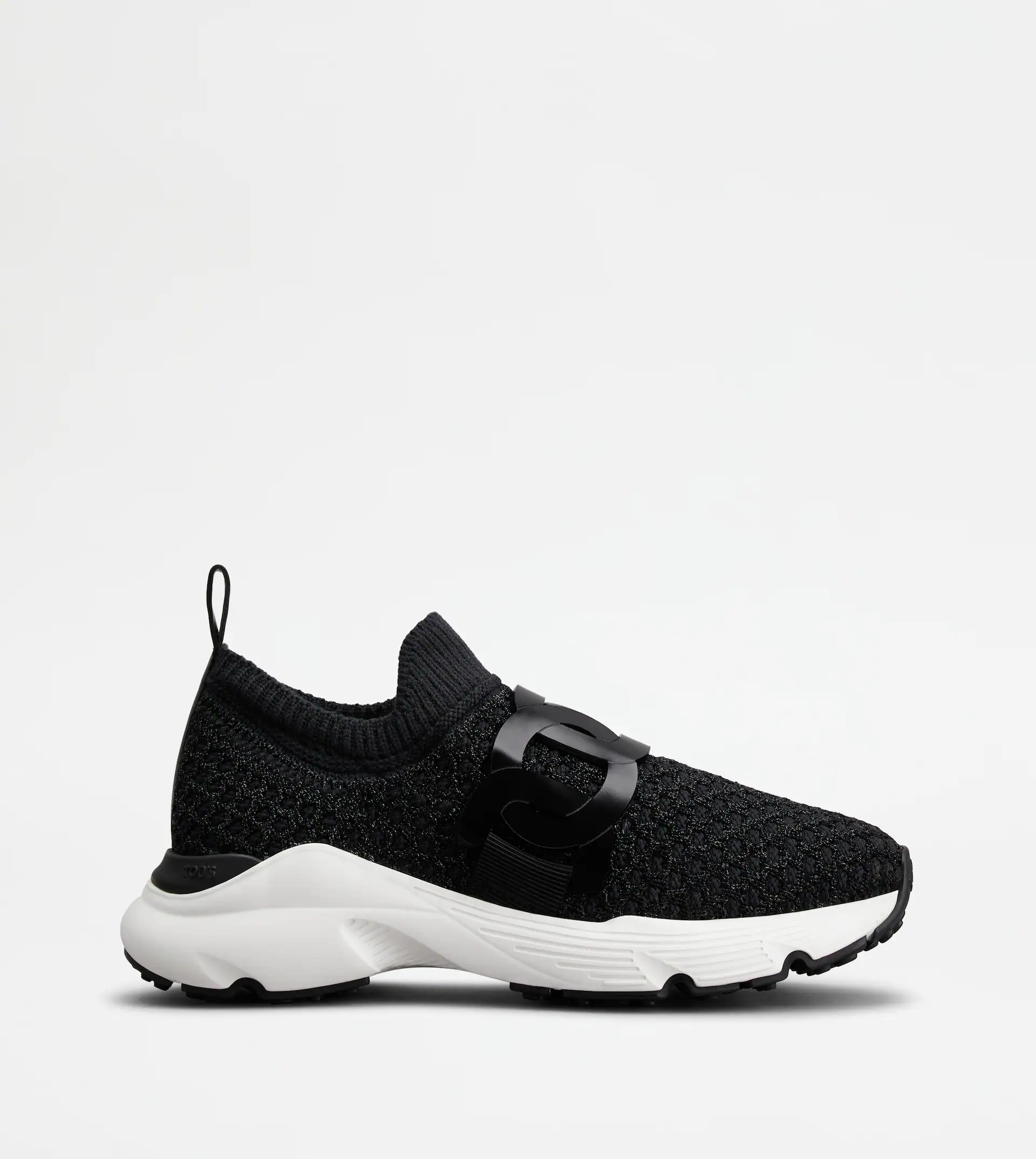 Sneakers running style characterized by lurex mix knit sock and chunky rubber outsole. Featuring leather chain accessory, they are a contemporary style that skillfully combines a dynamic mood and iconic elements with artisanal taste. - Made in Italy - Women's Tod's Kate Sneakers - Technical Fabric upper - Semi-shiny leather detailing - Leather chain accessory - Maintenance and care cards included - Branded dustbag