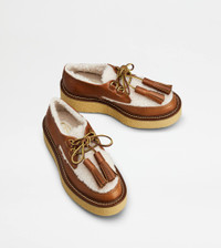 LACED PLATFORM LOAFERS IN LEATHER AND WOOL - BROWN, OFF WHITE