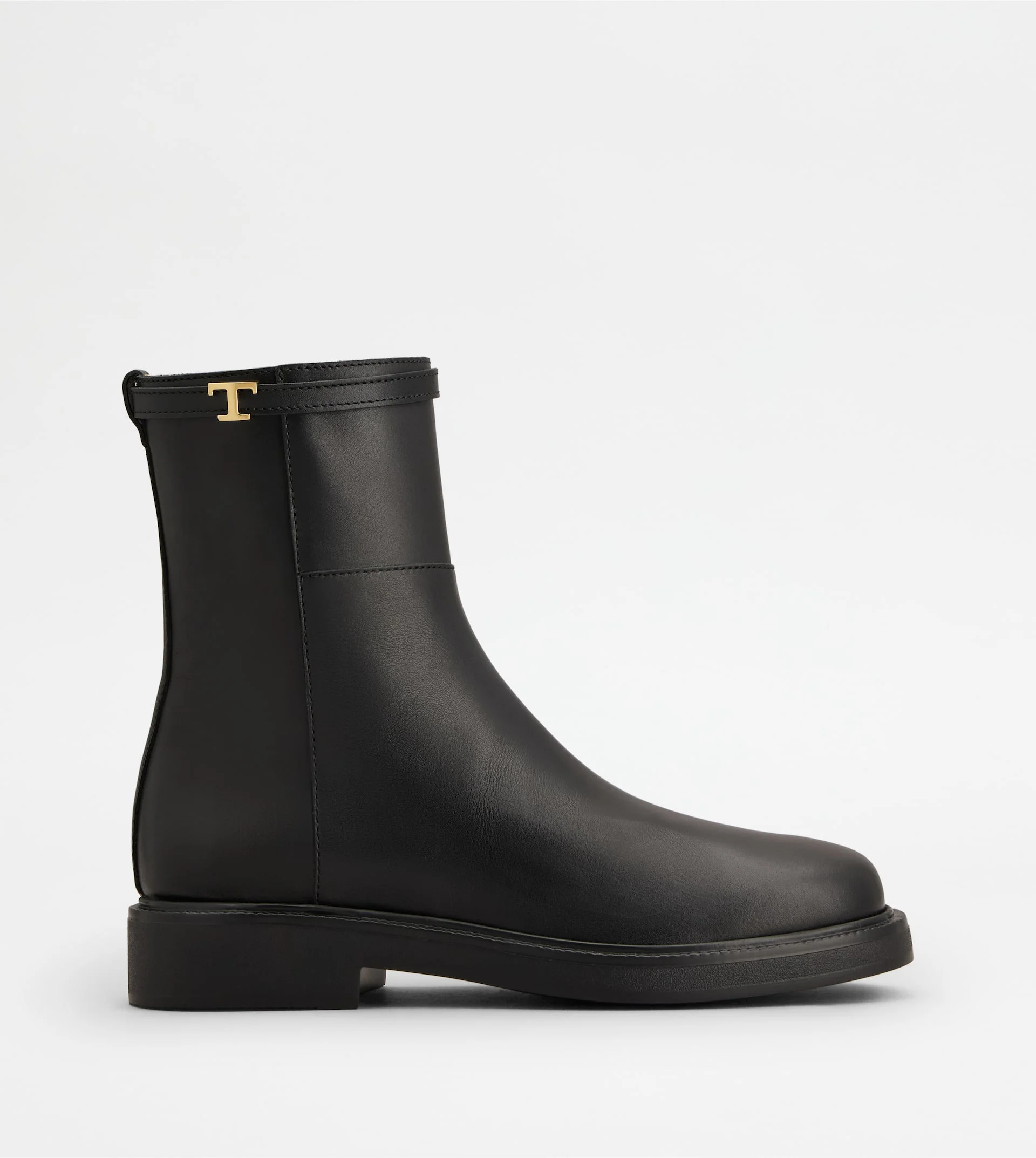 Ankle boots in calfskin leather with a decorative strap featuring T Timeless logo on the bootleg. Featuring a zip on the inside, this versatile style comes with a rubber outsole with embossed rubber pebbles. - Made in Italy - Women's ankle botts - Calfskin leather upper - Metal T Timeless logo on the bootleg - Zip on the inside - Leather lining and insole - Rubber outsole with embossed rubber pebbles - Maintenance and care cards included - Branded dustbag