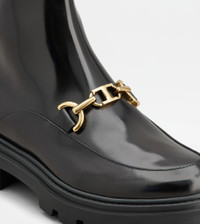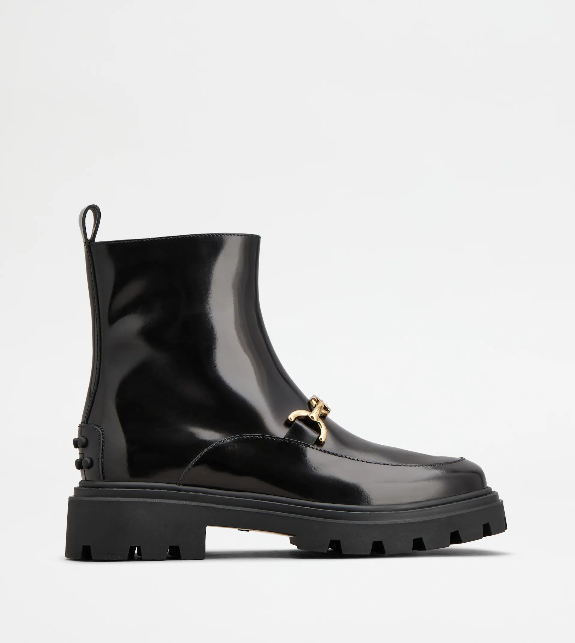 Ankle boots crafted in calfskin leather, with metal clamp and Tod's monogram. Featuring a zip on the inside and rubber pebble detailing on the heel, they come with a rubber chunky outsole with grooves and embossed rubber pebbles. - Made in Italy - Women's Tod's Ankle Boots - Calfskin leather upper - Zip on the inside - Rubber heel - Rubber lugged outsole - Maintenance and care cards included - Branded dustbag