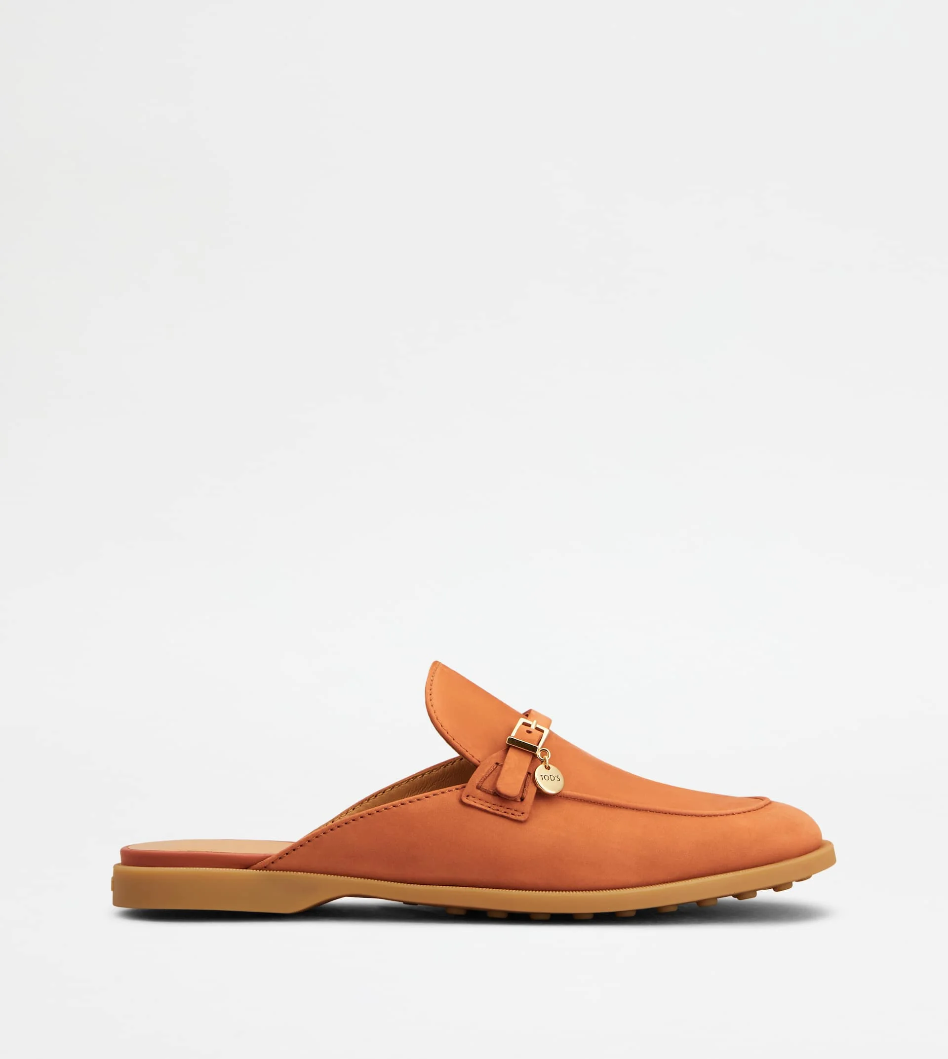 Mules in silky nubuck with decorative front strap and metal Tod's charm. Finished with maxi handmade stitching, they feature a rubber outsole with iconic embossed detailing and horseshoe-shaped heel. - Made in Italy - Women's mules - Calfskin nubuck upper - Decorative strap with buckle - Metal charm with Tod's logo - Leather lining and insole - Rubber outsole with embossed detailing - Maintenance and care cards included - Branded dustbag
