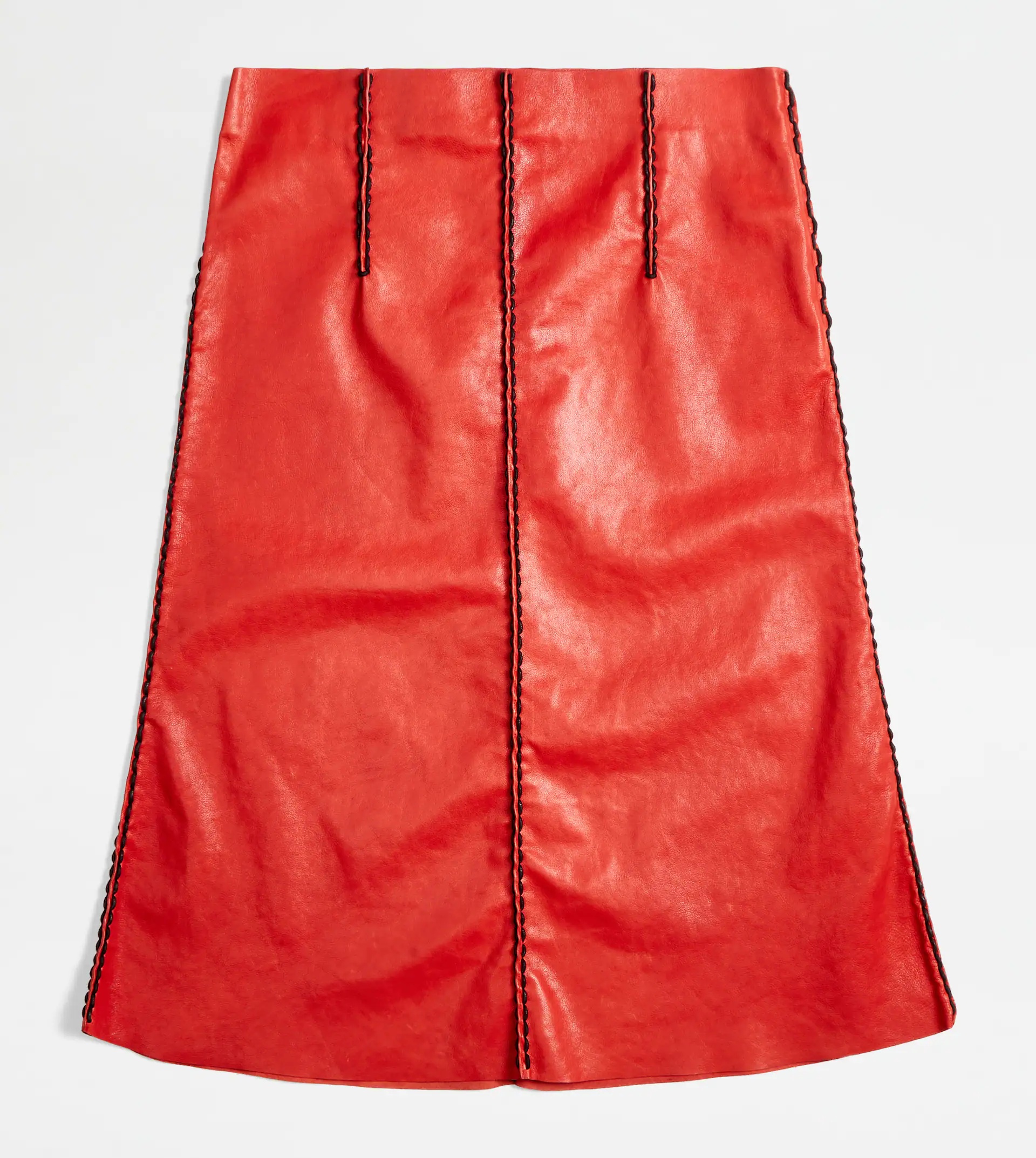 This flared skirt in soft nappa leather with a waxed finish is characterized by refined craftsmanship. Fastened with a side zip, it features ribbing emphasized by contrasting threading, a traditional Tod's craft adapted from the leather goods world. - Made in Italy - Women's Tod's Leather Skirt - The model is 180 cm and wears size 40 - Item composition: 100% ovine leather - Maintenance and care cards included