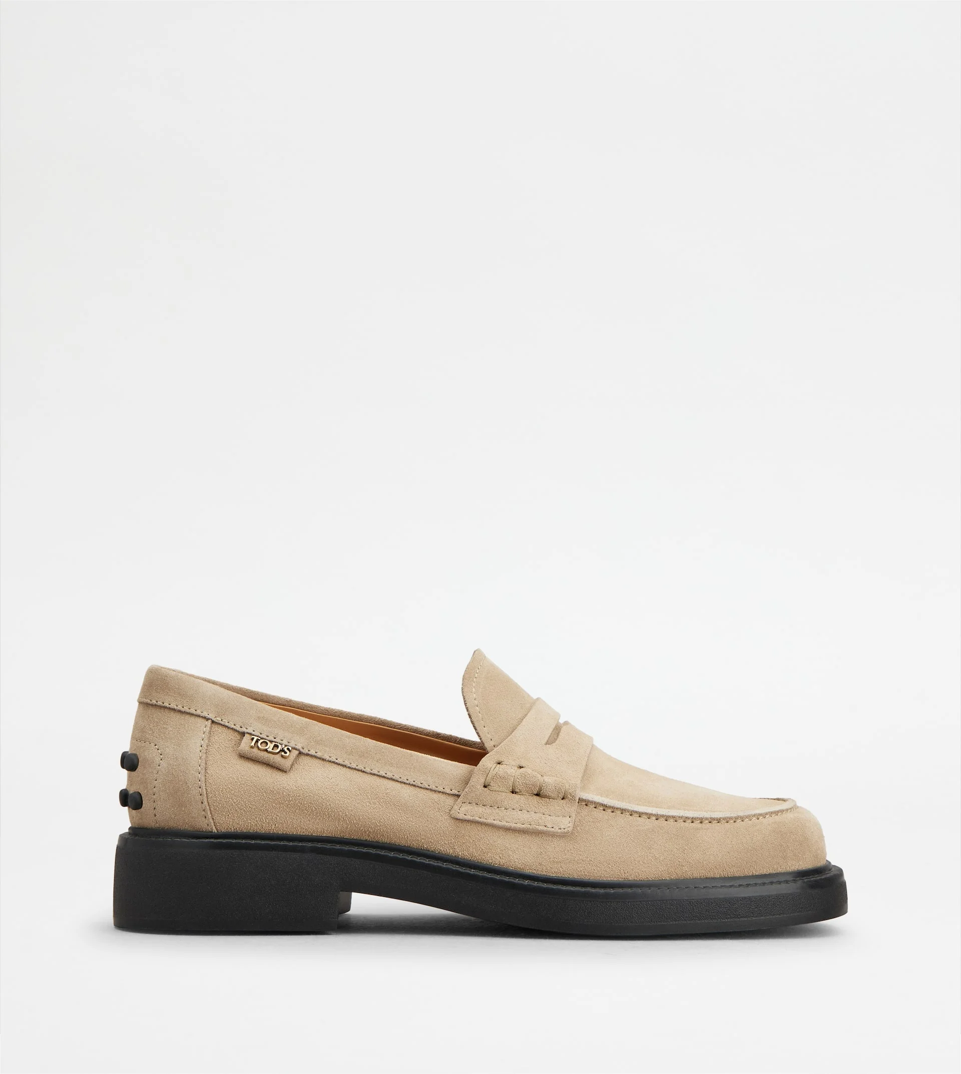 Loafers in soft suede, with penny bar and exposed handmade stitching. Featuring a side tongue with Tod's logo, they come with the rubber pebble detailing on the heel and a rubber outsole with embossed rubber pebbles. - Made in Italy - Women's suede loafers - Calfskin suede upper - Penny bar - Logo side tag - Leather insole - Rubber heel - Rubber outsole - Maintenance and care cards included - Branded dustbag