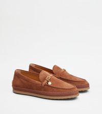 Loafers in suede, featuring a strap with mini tongue buckle and stamped Tod's logo pendant. Characterized by handmade stitching, they feature a rubber outsole with embossed rubber pebbles and raffia weaving. A versatile creation, with a fresh and refined look. - Made in Italy - Women's loafers - Calfskin suede upper - Strap with buckle and pendant - Handmade stitching - Leather lining and insole - Rubber pebble detailing on the heel - Rubber outsole with rubber pebbles - Raffia trim - Maintenance and care cards included - Branded dustbag
