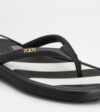 Thongs in soft calfskin leather, with metal Tod's logo and insole with patchwork stripes. Featuring a rubber outsole with iconic embossed detailing, they interpret an easy and sophisticated style at once. - Made in Italy - Women's sandals - Calfskin leather upper - Metal Tod's logo - Leather insole - Rubber outsole with embossed detailing - Maintenance and care cards included - Branded dustbag