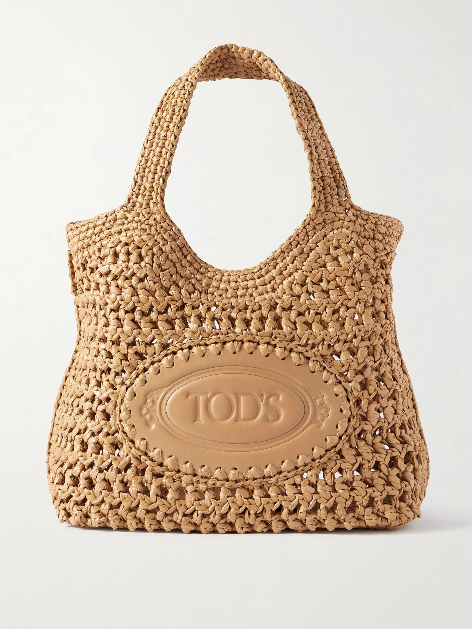 Raffia accessories are just the thing for summer. Tod's 'EBL' tote is crocheted for an open texture and has a logo-debossed leather panel at the front. This mini version has ample space for your SPF, water bottle and latest read. Details & Care - Raffia, tan leather (Calf) - Top handles - Unlined - Weighs approximately 2lbs/ 0.9kg
