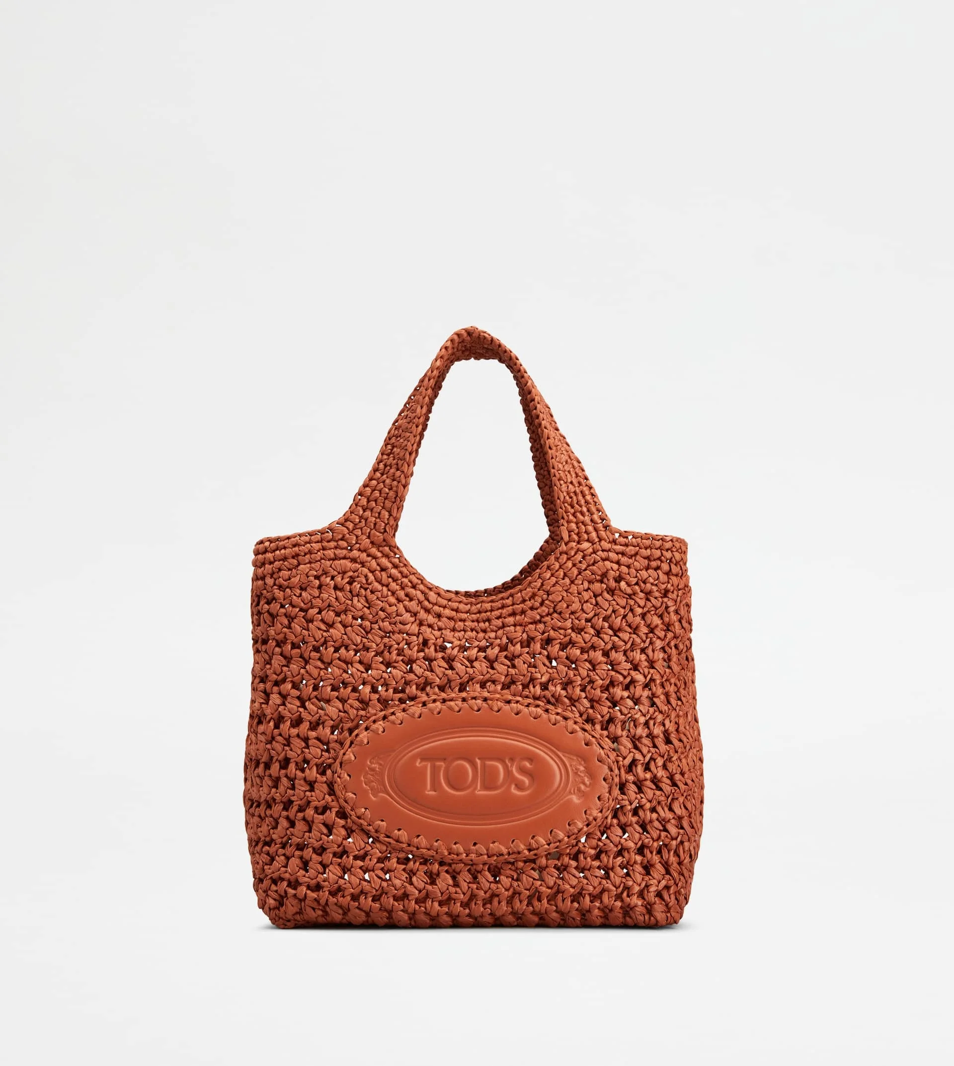 Shopping bag in raffia with handmade crochet knitting. Featuring the distinctive oval in leather with stamped Tod's logo, this creation with a summer mood comes with two fixed handles and a removable shoulder strap in leather. - Dimensions: L 9.8 ins x H 8.3 ins x D 4.7 ins - Handles: height (drop) 5.5 ins - Adjustable and removable shoulder strap: height (drop from the central hole) 20.5 ins, length max 45.3 ins - Made in Italy - Summer shopping bag - Item crafted in raffia (viscose) - Calfskin leather inserts - Tod's logo stamped on the front - Maintenance and care cards included - Branded dustbag