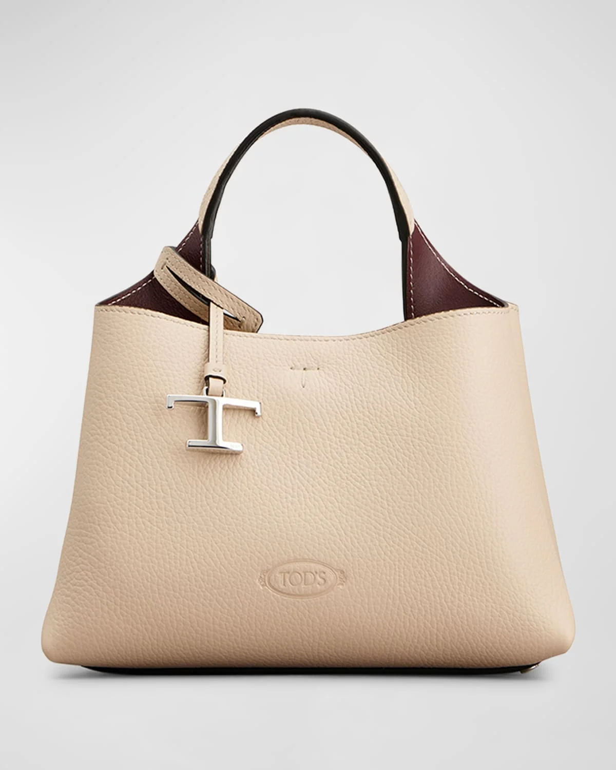 - Tod's top handle bag in calf leather - Top handle with removable T logo charm - Detachable, adjustable shoulder strap - Can be worn as a top handle or shoulder bag - Open top with lobster clasp closure - Center zip compartment divides interior - Feet protect bottom of bag - Approx. 6.6"H x 9.8"W x 5.7"D - Made in Italy