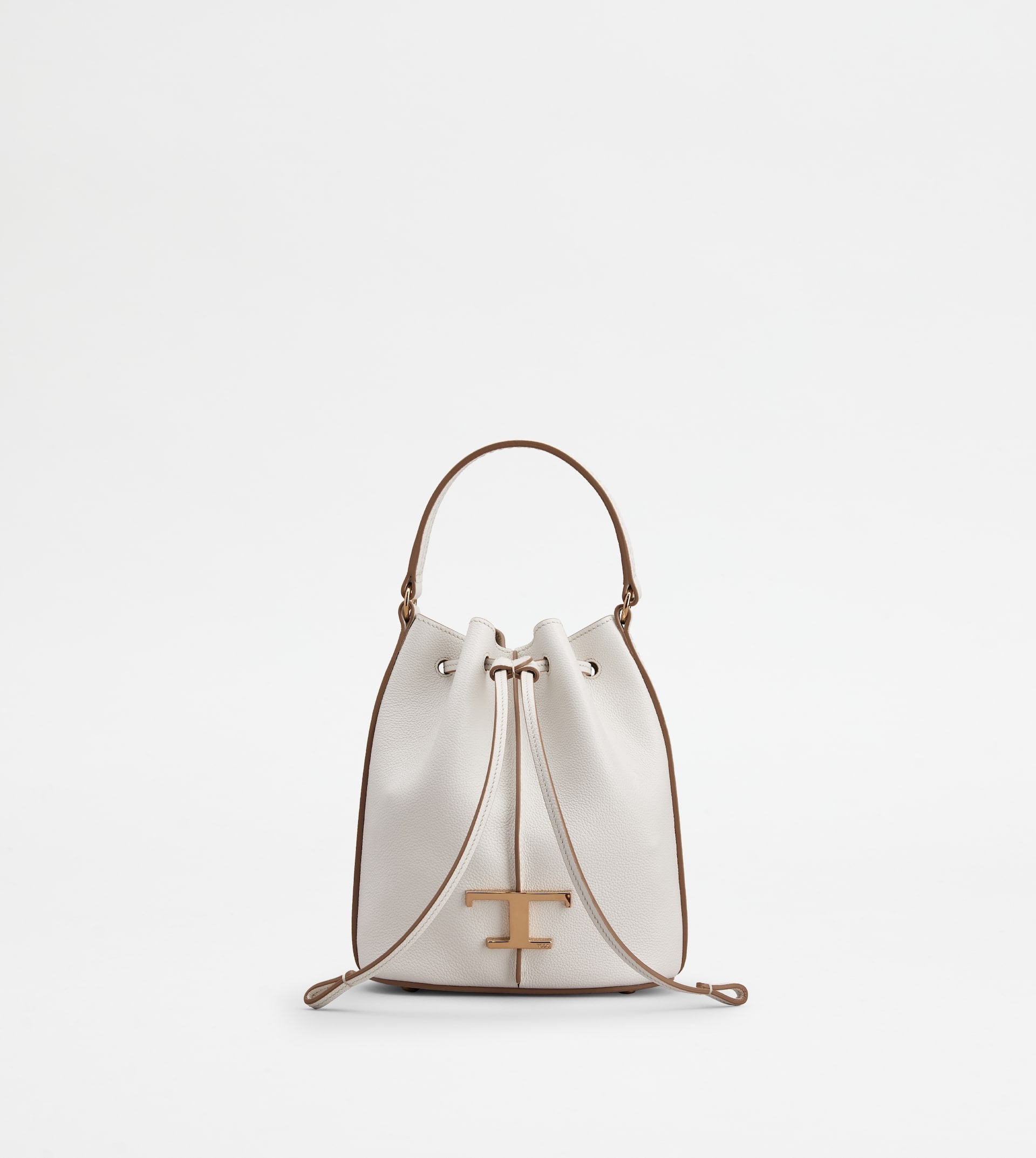 Bucket bag in hammered leather, with central ribbing and branded metal T Timeless accessory. With a practical drawstring closure, it features fixed flat handle and removable shoulder strap. A creation of timeless taste, enhanced by branded bottom feet. - Dimensions: 6.7 x 7.9 x 3.7 ins - Fixed handle, adjustable and removable shoulder strap 18.5 ins approx drop - Made in Italy - Women's Tod's Bucket Bag - Item crafted in leather - Branded metal T Timeless accessory - Drawstring closure - Bottom metal feet - Maintenance and care cards included - Branded dustbag