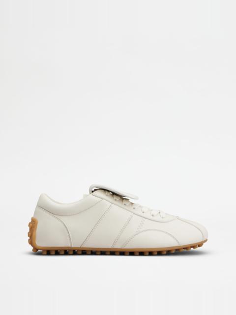Tod's T-Marathon sneakers take inspiration from the world of indoor football. The vintage-inspired upper is crafted in soft patent leather and suede, with removable maxi tongue for a versatile mood. The stitched outsole, that extends across the heel, features the distinctive rubber pebbles. Lightweight and comfortable, they express a relaxed and casual style, with a sophisticated touch. - Made in Italy - Women's Tod's Sneakers - Calfskin leather upper - Removable tongue with concealed magnet - Tod's logo stamped on the tongue - Leather lining and insole - Rubber outsole with rubber pebbles - Maintenance and care cards included - Branded dustbag - Additional laces included
