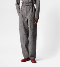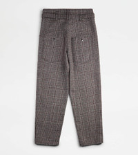 Pants in virgin wool with Prince of Wales pattern, maxi front pockets and patch back pockets with button. Fastened with zip, double snap and belt, they interpret a contemporary allure elegance. - Made in Italy - Women's pants with belt - The model is 5' 9'' and wears size 40 (IT) - Item composition: 100% virgin wool, lining 62% acetate, 38% polyester - Maintenance and care cards included