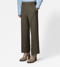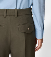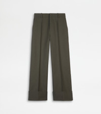 Pants in wool with crease, slanted pockets and wide turned-up hem. Fastened with zip, hook and counter-button, they feature the Tod's monogram embroidered on the back right pocket flap. - Made in Italy - Pants in wool - Fitting: regular - The model is 5' 9'' and wears size 38 (IT) - Item composition: 100% virgin wool - Maintenance and care cards included