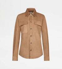 Slim-fit shirt in suede with anti-drip and anti-stain treatment. A unique material with an exceptional softness, lightweight thanks to its thin thickness yet compact and resistant. Fastened with buttons with the distinctive T-stitching, the garment features two flap pockets and the brand monogram embroidered over the shoulders. Functional and versatile, it can be worn also as a lightweight blouson. - Made in Italy - Suede overshirt - Fitting: slim - The model is 5' 9'' and wears size 38 (IT) - Item composition: 100% ovine leather, interior with nappa leather finishing - Maintenance and care cards included