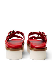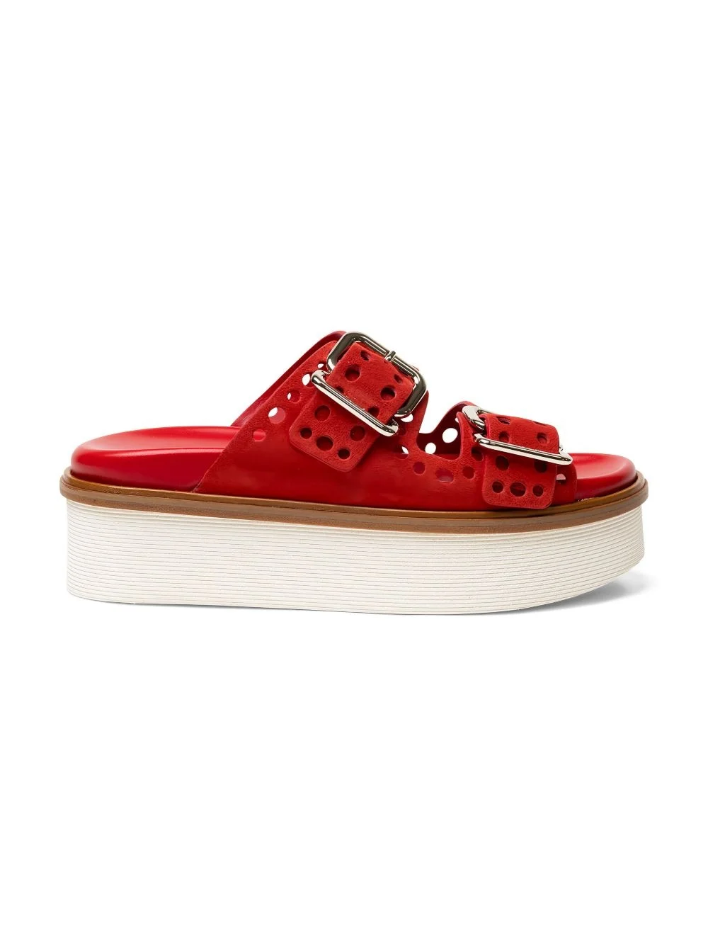 perforated buckle platform sandals Highlights - Red - Platform sole - Perforated detailing - Double buckle fastening - Leather footbed - Suede upper Made in Italy Composition Outer: Calf Suede 100% Sole: Rubber 100% Lining: Calf Leather 100% SIZE & FIT Measurement HEEL 2.34 in(5.9 cm) Washing instructions Hand Wash