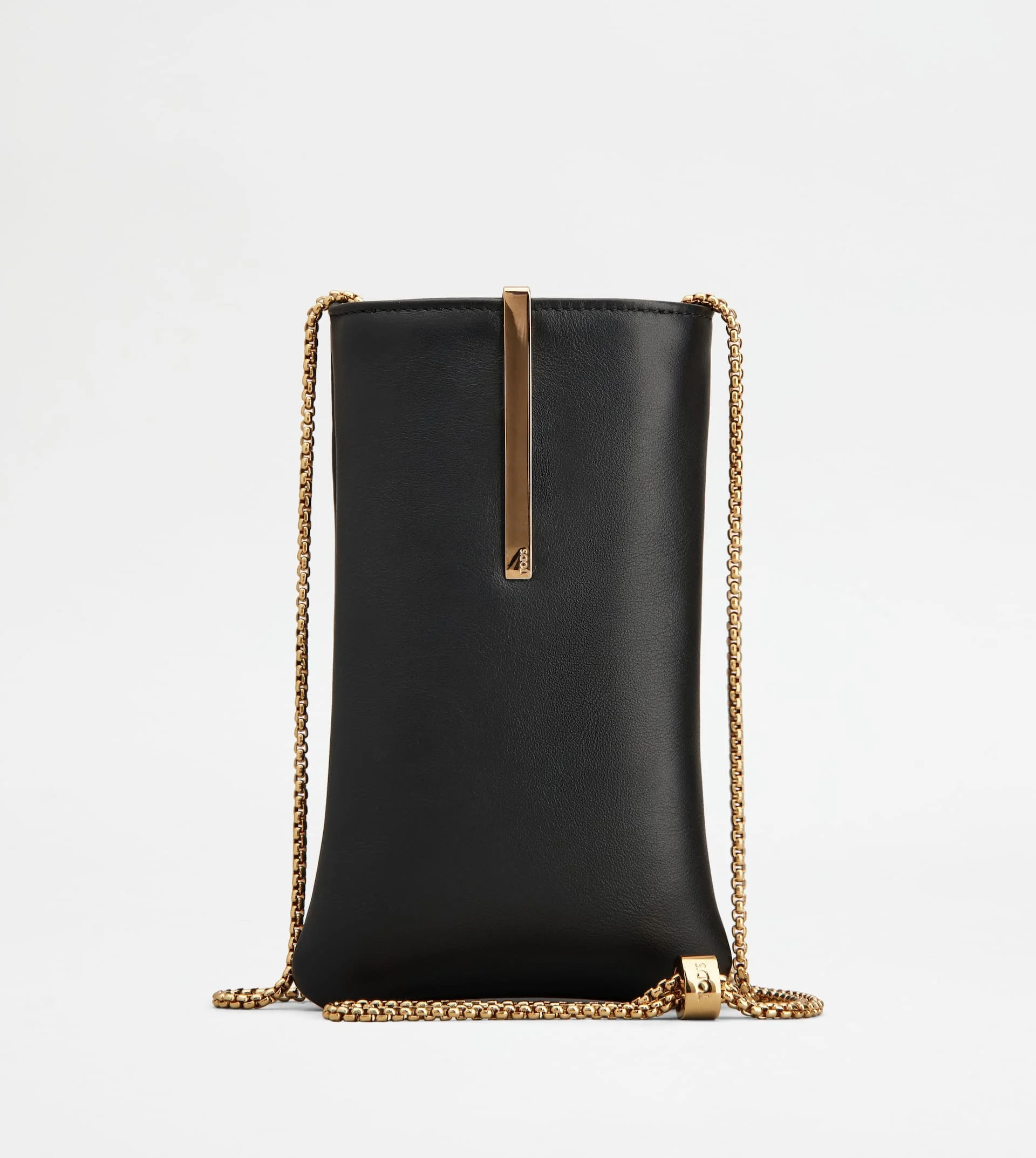 Phone holder in soft calfskin leather, with metal bar accessory and elegant chain strap with branded slider. - Dimensions: L 4.3 ins x H 7.1 ins x D 1.6 ins - Made in Italy - Phone holder in leather - Item crafted in calfskin leather - Metal bar accessory on the front - Metal chain strap - Maintenance and care cards included