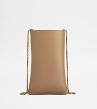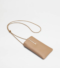 Phone holder in soft calfskin leather, with metal bar accessory and elegant chain strap with branded slider. - Dimensions: L 4.3 ins x H 7.1 ins x D 1.6 ins - Made in Italy - Phone holder in leather - Item crafted in calfskin leather - Metal bar accessory on the front - Metal chain strap - Maintenance and care cards included