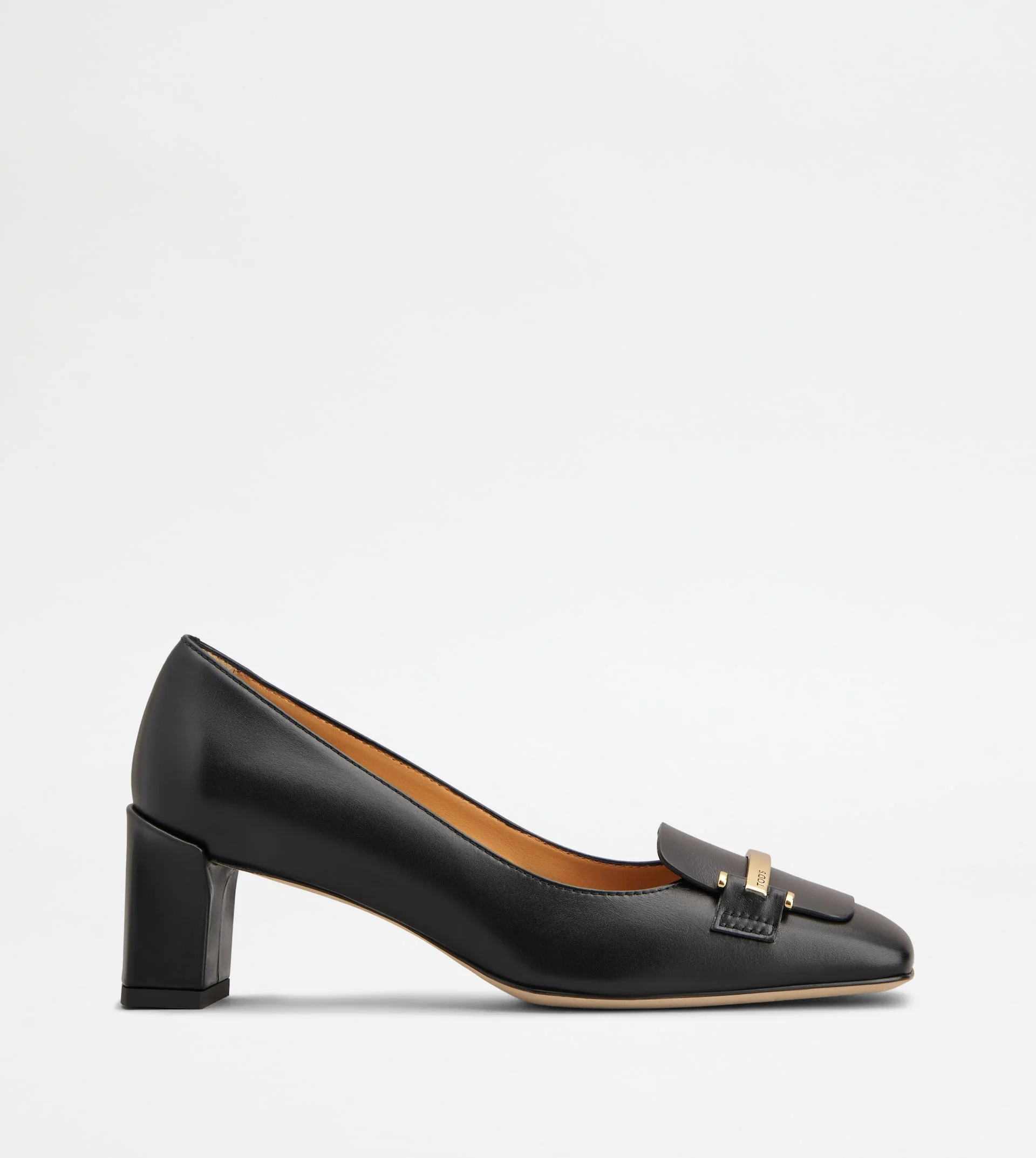Pumps in precious calfskin leather, with branded metal bar secured on the side, geometric heel and leather outsole. - Made in Italy - Women's Tod's Pumps - Calfskin leather upper - Branded metal bar - Leather lining and insole - Covered heel 2 ins - Leather outsole - Maintenance and care cards included - Branded dustbag