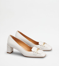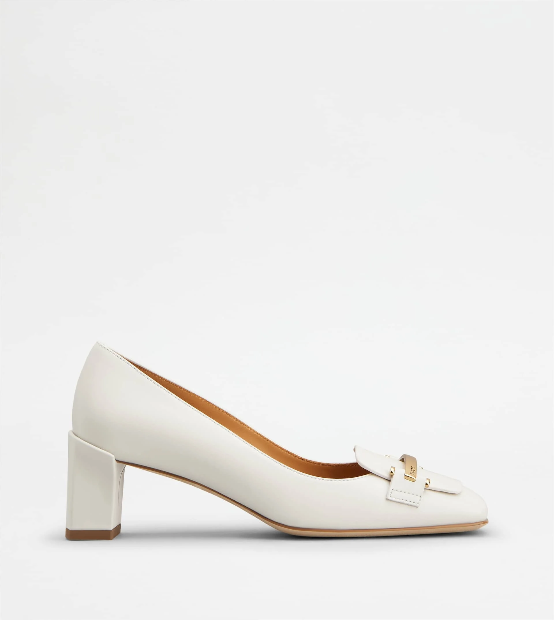 Pumps in precious calfskin leather, with branded metal bar secured on the side, geometric heel and leather outsole. - Made in Italy - Women's Tod's Pumps - Calfskin leather upper - Branded metal bar - Leather lining and insole - Covered heel 2 ins - Leather outsole - Maintenance and care cards included - Branded dustbag