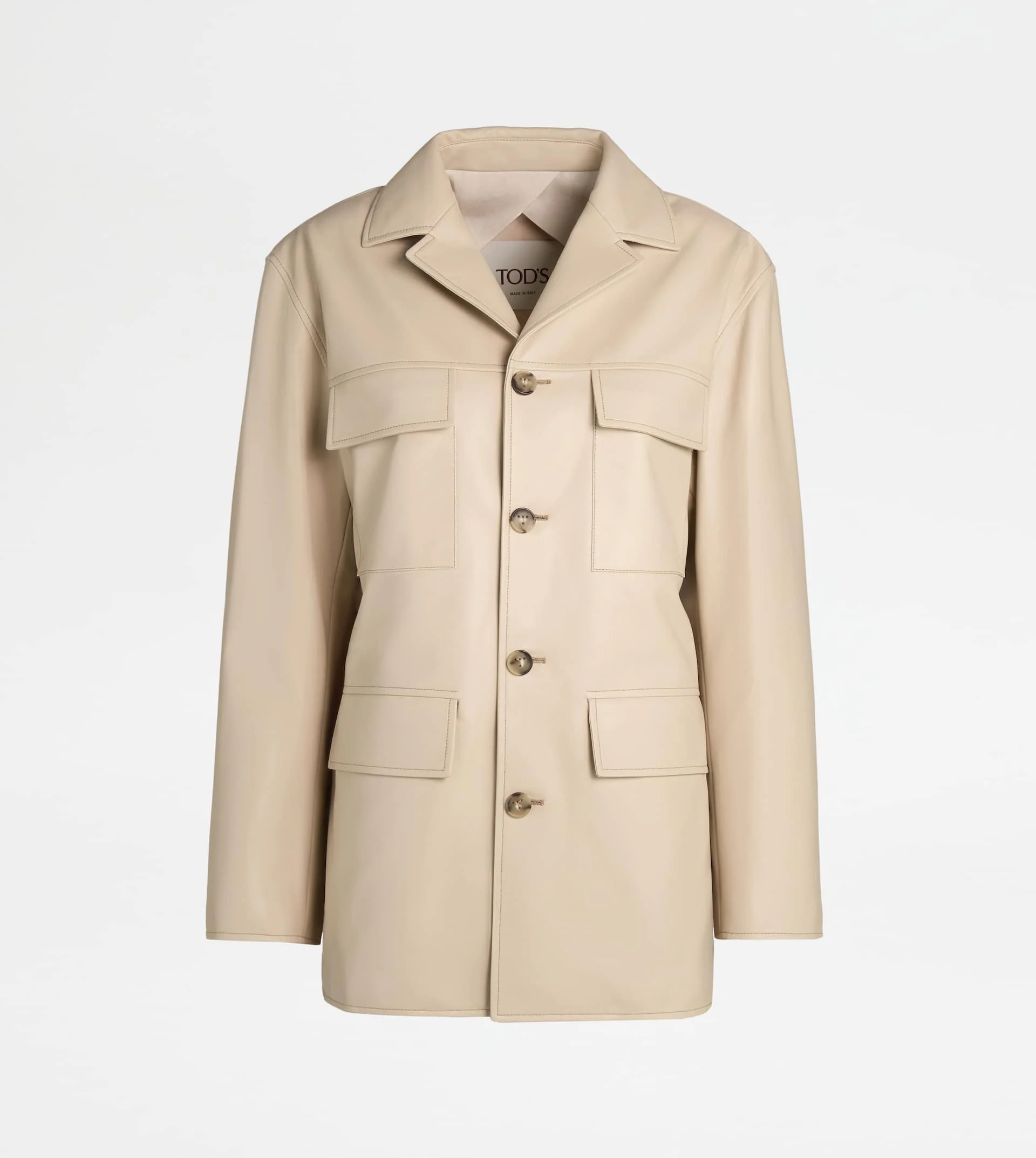 Relaxed-fit safari jacket in soft leather, with adjustable belt on the back. Featuring the distinctive flap pockets, it comes with buttons with the distinctive brand's T-stitching. The Tod's monogram hand-embroidered on the yoke adds a further distinctive detailing to the garment - Made in Italy - Safari jacket in leather - Fitting: relaxed - Item composition: 100% ovine leather, lining100% cotton, second lining 100% viscose - Maintenance and care cards included