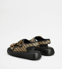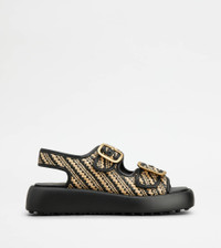 Sandals in straw effect fabric and leather piping. Featuring two bands with a branded metal buckle, they come with a slightly padded insole and rubber outsole with embossed rubber pebbles. An urban style with easy-chic mood. - Made in Italy - Women's sandals - Fabric upper - Leather piping - Heel strap - Leather insole - Rubber outsole with embossed rubber pebbles - Maintenance and care cards included - Branded dustbag