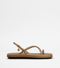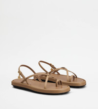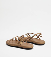 Characterized by thins crossed bands, these sandals are crafted in soft calfskin leather enriched by a metal medal with stamped Tod's logo. Featuring a rubber outsole with embossed rubber pebbles, they are an extremely versatile easy chic creation. - Made in Italy - Women's Tod's Sandals - Calfskin leather upper - Branded metal medal - Leather lining and insole - Rubber outsole with embossed rubber pebbles - Maintenance and care cards included - Branded dustbag
