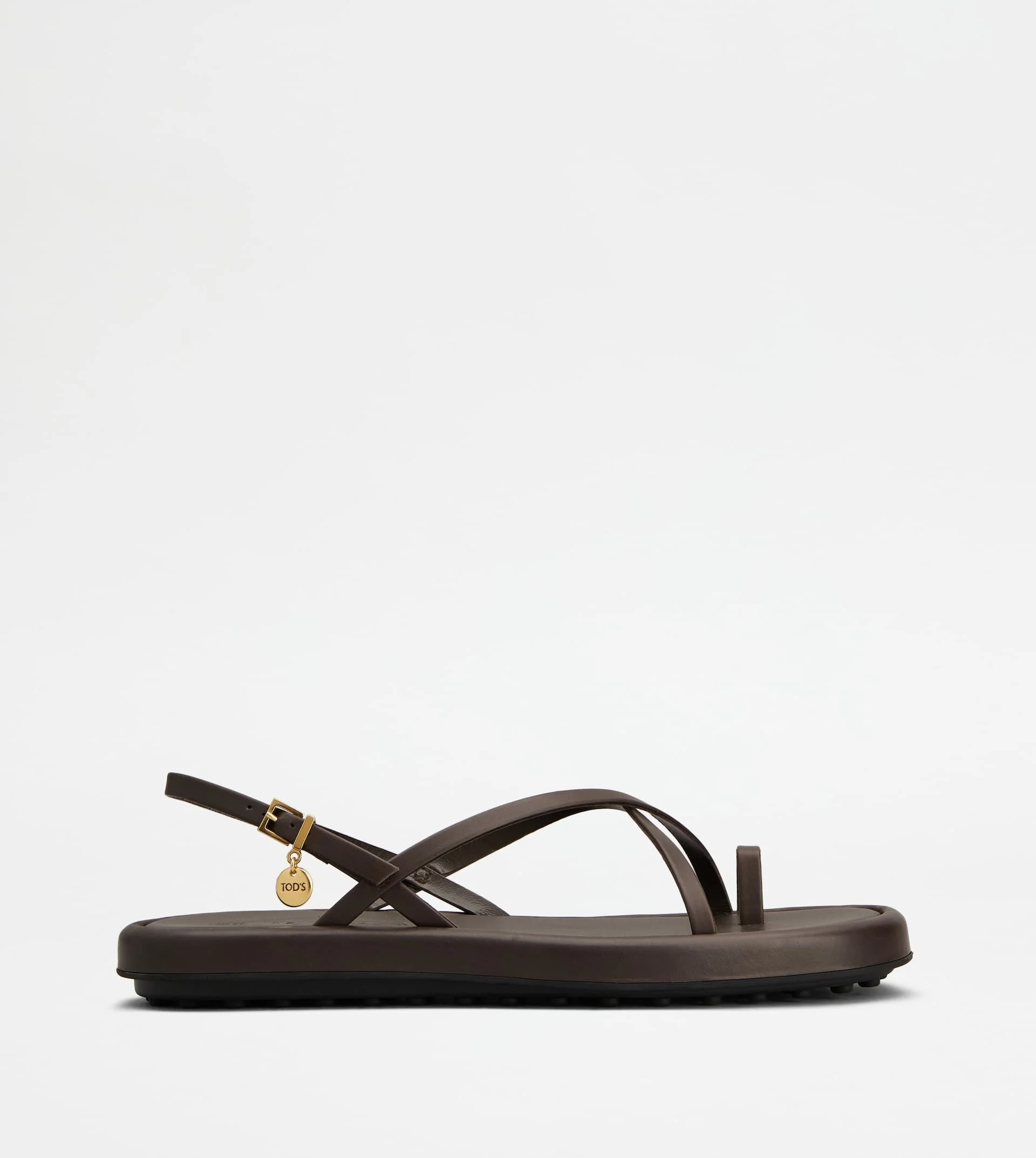 Characterized by thins crossed bands, these sandals are crafted in soft calfskin leather enriched by a metal medal with stamped Tod's logo. Featuring a rubber outsole with embossed rubber pebbles, they are an extremely versatile easy chic creation. - Made in Italy - Women's Tod's Sandals - Calfskin leather upper - Branded metal medal - Leather lining and insole - Rubber outsole with embossed rubber pebbles - Maintenance and care cards included - Branded dustbag