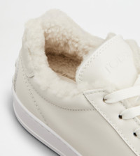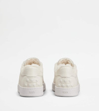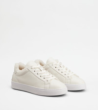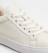 A sober and essential line characterizes these sneakers in calfskin leather, lined in soft shearling. Featuring a rubber outsole, they come with the Tod's logo on the tongue and the distinctive rubber pebbles on the heel. - Made in Italy - Women's sneakers - Calfskin leather - Tod's logo stamped on the tongue - Shearling lining and insole - Rubber outsole with rubber pebbles - Rubber pebble detailing on the heel - Maintenance and care cards included - Branded dustbag - Additional laces included
