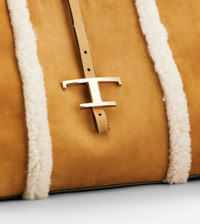 Medium shopping bag with flowing lines in suede, with soft sheepskin piping and lining. Featuring the branded metal T Timeless pendant, it comes with two practical handles and wide compartment with removable pouch. - Dimensions: L 18.5 ins (extended compartment) x H 11.4 ins x D 5.5 ins - Handles: height (drop) 10.2 ins - Made in Italy - Suede shopping bag - Item crafted in calfskin leather - Merinos lambskin fur inserts and lining - Branded metal T Timeless pendant - Strap and snap button closure - Removable pouch in leather - Branded metal feet - Maintenance and care cards included - Branded dustbag