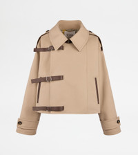 Oversize double-breasted short trench coat, characterized by a maxi collar and leather straps with branded metal buckles. Crafted in slightly stretch cotton double fabric, with jacquard check pattern on the inside, it comes with frogs on the shoulders and cuffs. Featuring double welt pockets, it is enriched by the Tod's monogram hand-embroidered on the back. - Made in Italy - Jacket in cotton - Fitting: comfort - The female model is 5' 9'' an wears size 38 (IT) - Item composition: 99% cotton, 1% elastane, interior 100% cotton, ovine leather inserts - Maintenance and care cards included