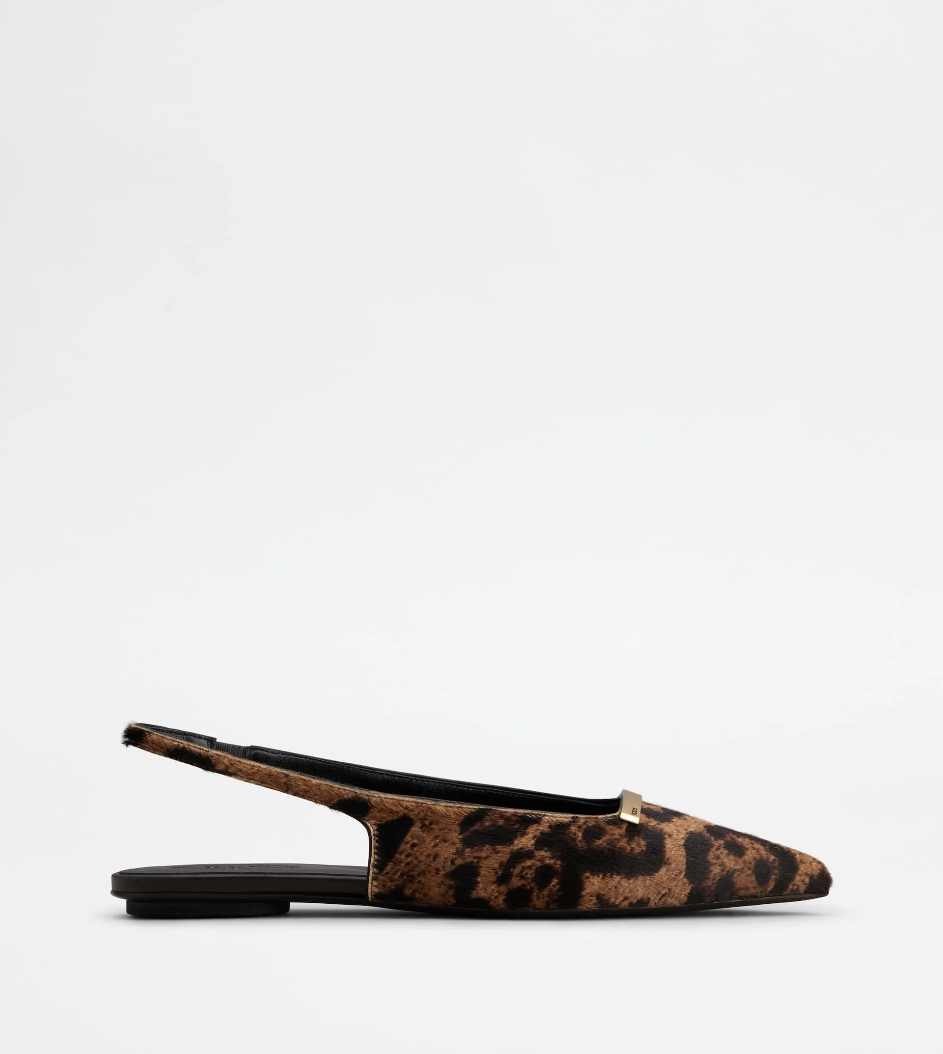 Characterized by a flat outsole, these slingback ballerinas come with a tapered toe and branded metal bar accessory. The minimal and elegant line is emphasized by a pony effect calfskin leather. - Made in Italy - Women's Tod's slingback ballerinas - Pony effect calfskin leather upper - Branded metal bar accessory - Strap with elastic insert on the back - Leather lining and insole - Leather outsole with rubber toe and heel - Maintenance and care cards included - Branded dustbag
