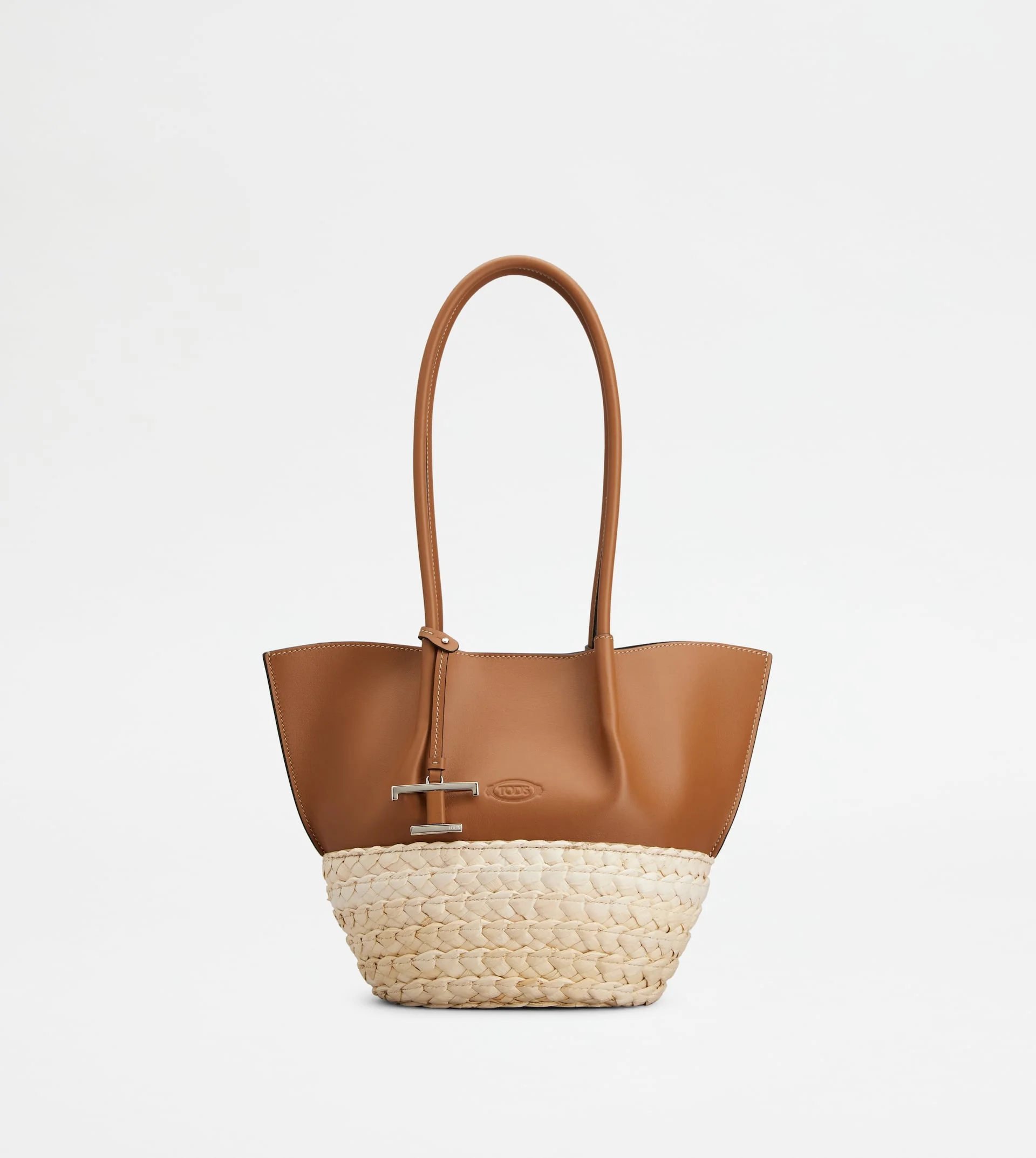 A combination of contemporary design and traditional craftsmanship, this small shopping bag is crafted in calfskin nappa leather, with a handwoven corn leaf base. Featuring long handles secured with the distinctive stitching, it features Tod's logo stamped on the front and the T Timeless pendant. Practical and lightweight, it is perfect in the city as well as on vacation thanks to its ambivalent mood. - Dimensions: L 12.4 ins x H 8.7 ins x D 5.1 ins - Handles: height (drop) 10.2 ins - Made in Italy - Summer shopping bag - Item crafted in calfskin leather - Bottom in straw (corn leaves) - Removable T Timeless pendant in metal and leather - Tod's logo stamped on the front - Magnet closure - Maintenance and care cards included - Branded dustbag