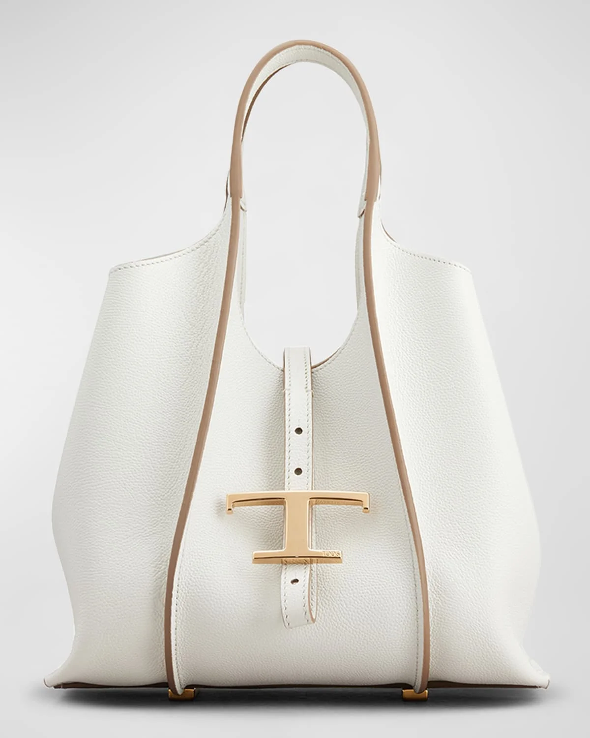 - Tod's shopping tote bag in leather - Flat top handles - Detachable, adjustable shoulder strap - Can be worn as a top handle or shoulder bag - Open top with adjustable T logo center strap - Interior, leashed zip pouch bag - Lining: Nylon - Feet protect bottom of bag - Approx. 7.6"H x 11.8"W x 4.7"D - Made in Italy
