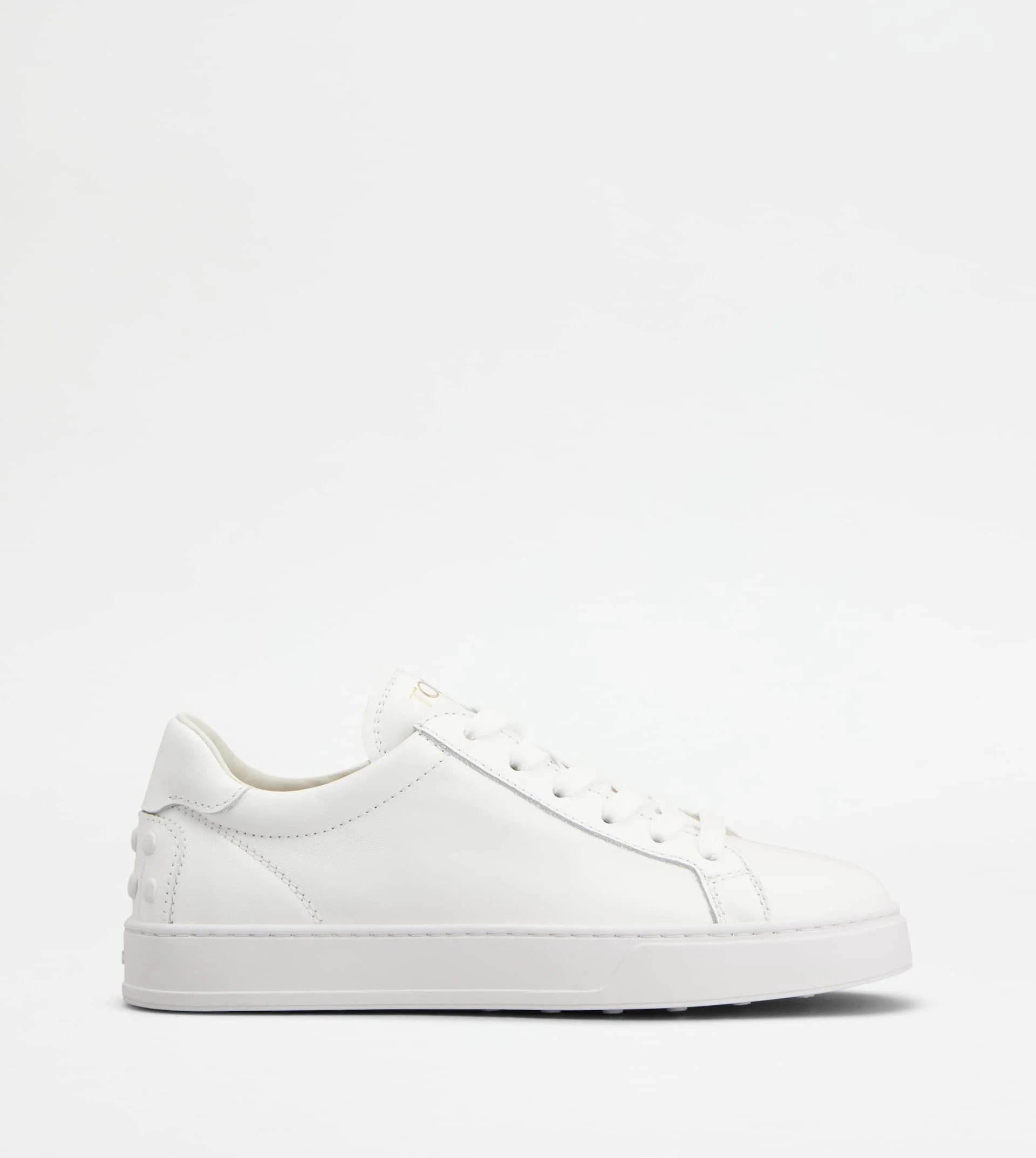 A sober and essential line characterizes these sneakers in soft calfskin leather. Featuring a rubber outsole, they come with the Tod's logo on the tongue and the distinctive rubber pebbles on the heel. - Made in Italy - Women's sneakers - Calfskin leather upper - Tod's logo stamped on the tongue - Leather lining ad insole - Rubber outsole with rubber pebbles - Rubber pebble detailing on the heel - Maintenance and care cards included - Branded dustbag