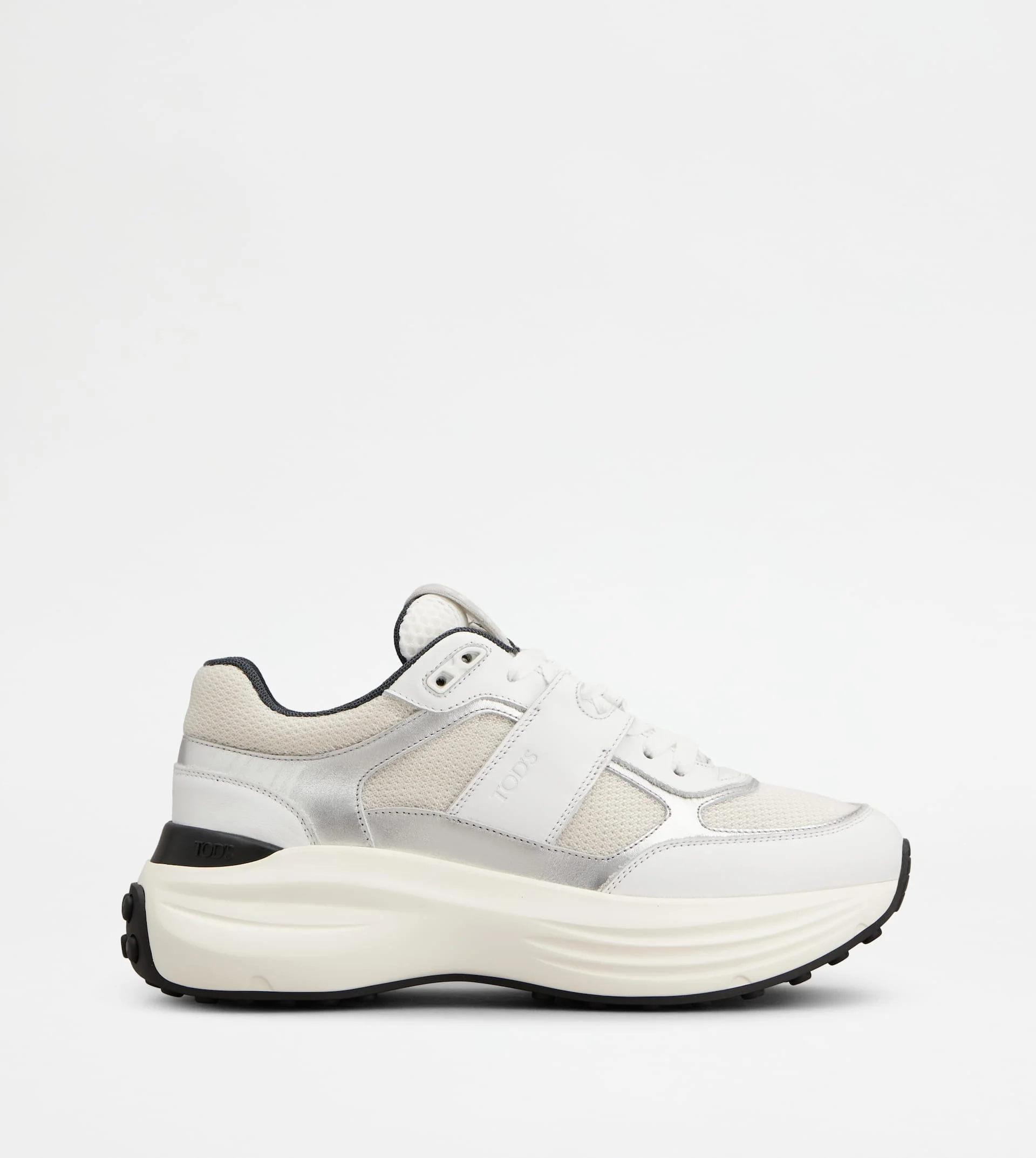 SNEAKERS IN LEATHER AND FABRIC - WHITE, SILVER