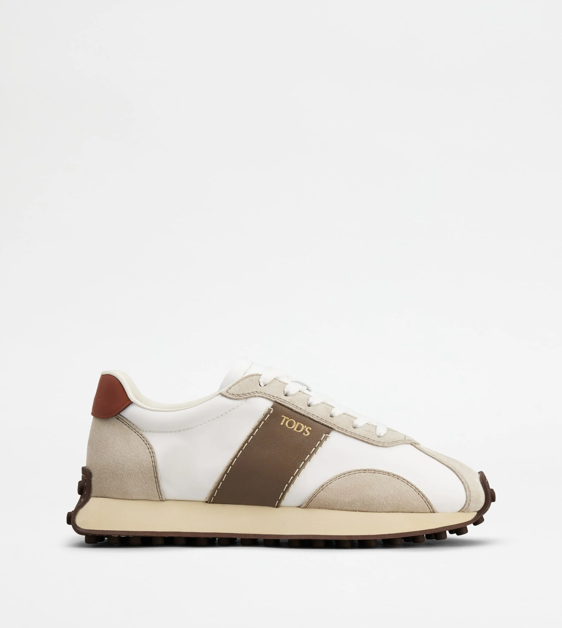 SNEAKERS IN LEATHER AND TECHNICAL FABRIC - BEIGE, BROWN, WHITE