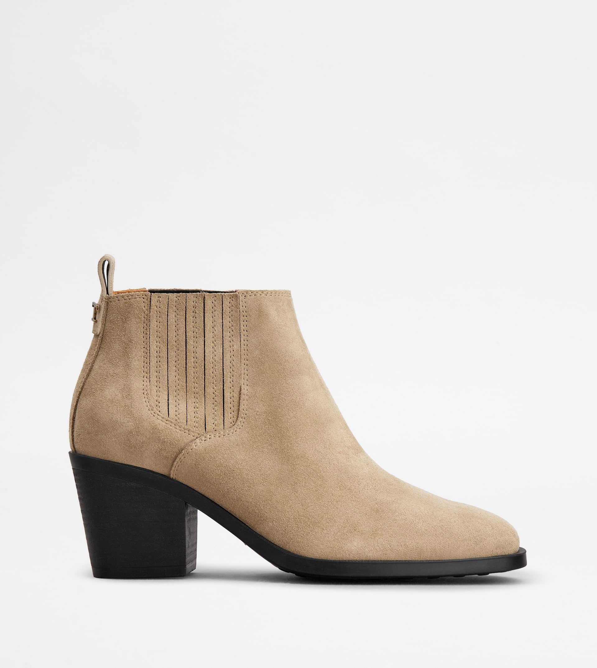 Ankle boots in calfskin suede with side elastic inserts, metal Tod's monogram on the back, leather heel and rubber outsole with embossed rubber pebbles. - Made in Italy - Women's Tod's Ankle Boots - Calfskin suede upper - Side elastic inserts - Metal Tod's monogram - Leather heel with rubber insert 2.6 ins - Rubber outsole with embossed rubber pebbles - Maintenance and care cards included - Branded dustbag