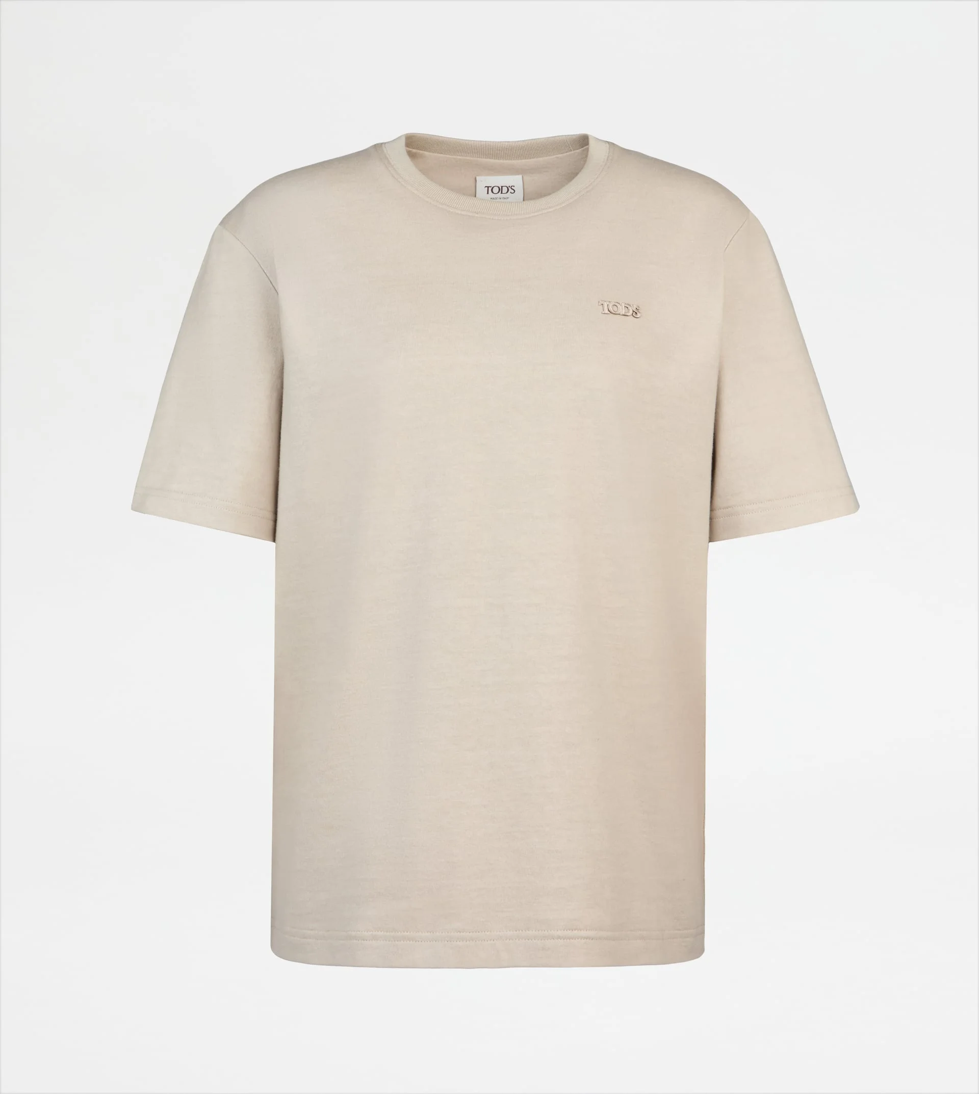 Short-sleeved round-neck T-shirt in jersey, characterized by the Tod's patch applied on the chest. - Made in Italy - T-shirt in jersey - Fitting: regular - Item composition: 100% cotton - Maintenance and care cards included