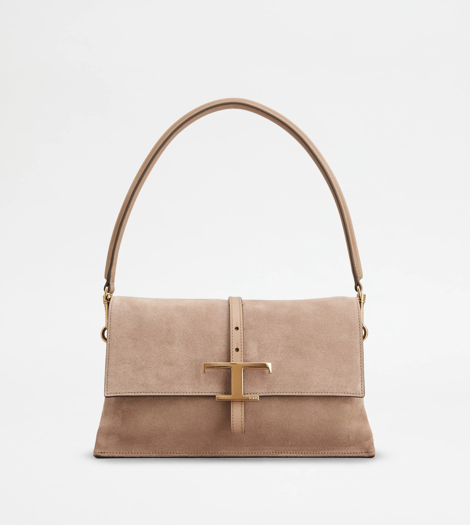 Crafted in calfskin suede, this mini bag comes with the branded metal T Timeless accessory. Featuring a fixed handle and a removable shoulder strap, it comes with a suede interior divided into three practical compartments. Complemented by a back pocket, it is a model with a soft and deconstructed shape, perfect for the everyday look. - Dimensions: L 10.4 ins x H 6.3 ins x D 2.4 ins - Handle: height 7.5 ins - Adjustable and removable shoulder strap: height (drop from the central hole) 19.7 ins, length max 47 ins - Made in Italy - Shoulder bag in leather - Item crafted in calfskin suede - Branded metal T Timeless accessory - Back pocket - Magnet closure - Suede interior - 3 compartments - Pocket with cardslots - Maintenance and care cards included - Branded dustbag