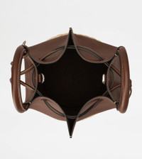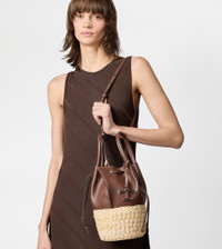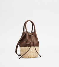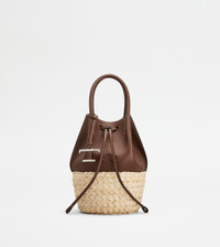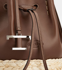 A combination of contemporary design and traditional craftsmanship, this mini bucket bag is crafted in calfskin nappa leather, with a handwoven corn leaf base. Featuring handles secured with the distinctive stitching, it features a removable shoulder strap, Tod's logo stamped on the front and the T Timeless pendant. Practical and lightweight, it is perfect in the city as well as on vacation thanks to its ambivalent mood. - Dimensions: L 7.1ins x H 9.1 ins x D 7.1 ins - Handles: height (drop) 4.3 ins - Adjustable and removable shoulder strap: height (drop) 18.9 ins, length max 42.9 ins - Made in Italy - Summer bucket bag - Item crafted in calfskin leather - Bottom in straw (corn leaves) - Removable T Timeless pendant in metal and leather - Tod's logo stamped on the front - Drawstring closure - Maintenance and care cards included - Branded dustbag