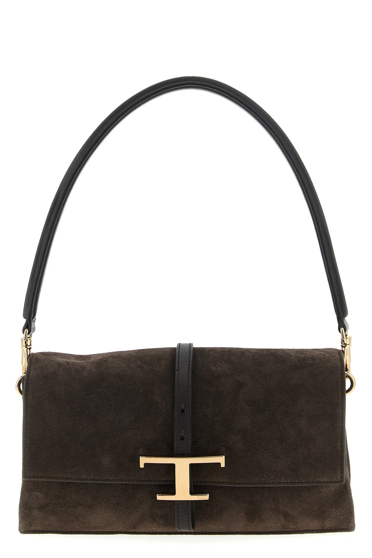 cod. XBWTSEC9100P3AS808 Mini shoulder bag in suede and leather with three bellows, magnetic flap closure with metal 'T Timeless' logo on the front, back pocket, removable handle, adjustable and removable shoulder strap. Color: Brown Size & Fit: W 26.5 x H 16 x D 6 cm Composition: 100% calfskin leather (Bos Taurus) Made in: Italy