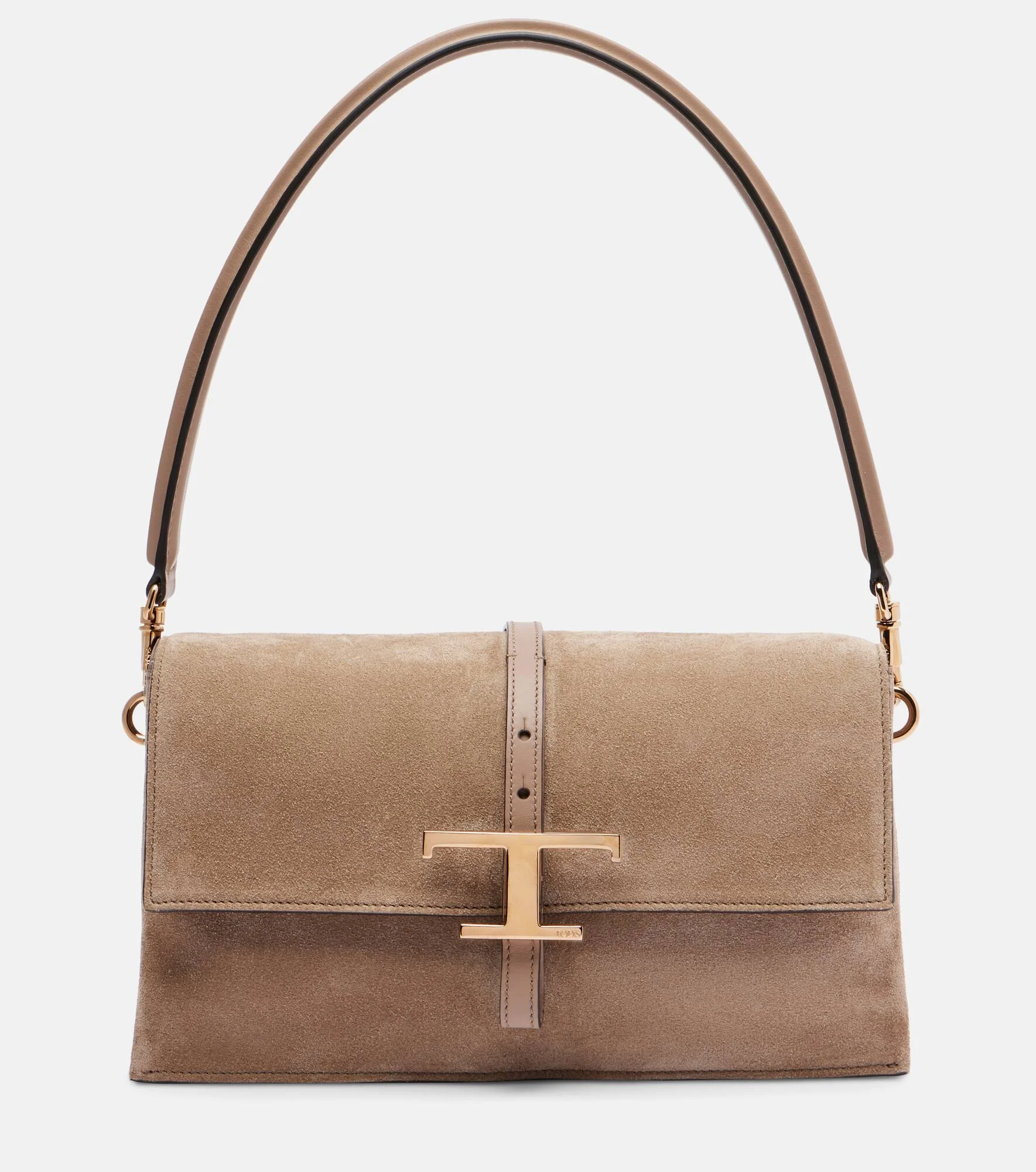 Tod's embodies the art of Italian craftsmanship with superior fabrications and timeless silhouettes that lend a sense of quiet sophistication. This Mini suede shoulder bag comes with three compartments, a detachable shoulder strap, and the signature T Timeless charm. Product Details - Material: calf leather (suede) - Lining: suede - Made in Italy - Color: brown - Designer color name: Coca Mocha + Creta Ch - Item color: brown - Hardware color: gold - Closure: magnetic fastening - Internal details: three internal compartments, Card slots, internal slot pocket - Detachable shoulder strap - Includes: dust bag, box - Item number: P01129346 Size & Fit - Height 15cm-6" - Width 24,5cm-9.5" - Depth 12cm-4.5" - Length of handle 54cm-21.5" - Adjustable shoulder strap - Min. length shoulder strap 106cm-41.5" - Max. length shoulder strap 122cm-48"