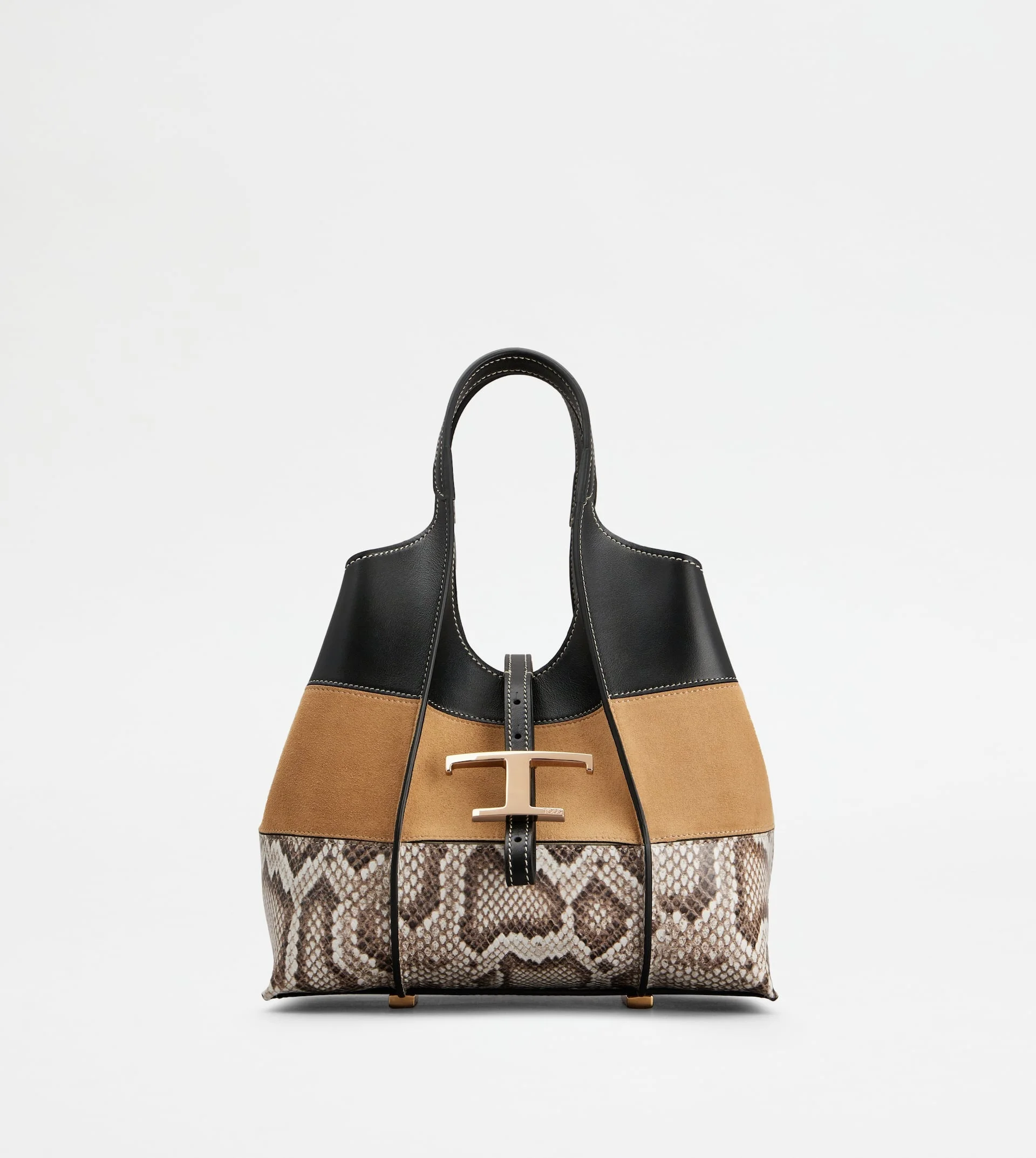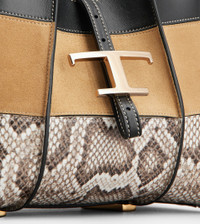 Shopping bag with flowing lines crafted in full grain leather, with suede and reptile print inserts. Featuring the iconic branded metal T Timeless pendant accessory, it comes with two fixed handles and an adjustable and removable shoulder strap. The internal compartment, with adjustable size, is complemented by a removable pouch. A new combination of craftsmanship tradition and contemporary elegance. - Dimensions: L 11.8 ins x H 8.3 ins x D 6.3 ins - Handles: height (drop) 5.9 ins - Adjustable and removable shoulder strap: length max 42.5 ins - Made in Italy - Leather shopping bag - Item crafted in full grain leather - Suede and reptile print leather inserts - Branded metal T Timeless pendant - Strap and snap closure - Removable leather zipped pouch - Metal feet - Maintenance and care cards included - Branded dustbag