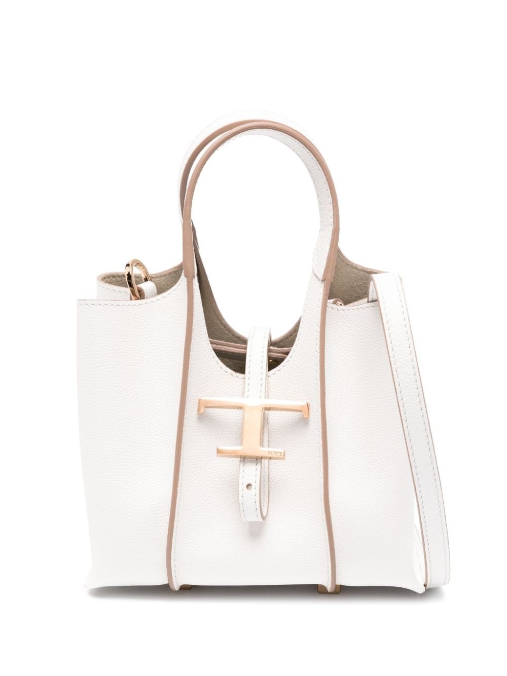 T Timeless mini bag Highlights - Milk white - Calf leather - Pebbled texture - Contrasting trim - T timeless pendant - Two top handles - Adjustable detachable shoulder strap - Main compartment - Suede lining - Metal feet - Logo-engraved gold-tone hardware - Concealed press-stud fastening - This piece comes complete with a protective dust bag. Made in Italy Composition Outer: Calf Leather 100% SIZE & FIT Model measurements Height 5 ft 9 in(1.76 m) Bust/Chest 32.28 in(82 cm) Hips 35.03 in(89 cm) Waist 24.8 in(63 cm) Measurement DEPTH 3.93 in(10 cm) HANDLE 3.93 in(10 cm) HEIGHT 5.11 in(13 cm) STRAP 46.45 in(118 cm) WIDTH 6.69 in(17 cm)