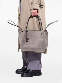 drawstring suede tote bag Highlights - Grey - Calf suede - Double top-handle - Drawstring closure - Silver-tone logo charm Made in Italy Composition Outer: Calf Suede 100% SIZE & FIT Measurement DEPTH 6.29 in(16 cm) HEIGHT 9.84 in(25 cm) WIDTH 13.77 in(35 cm)